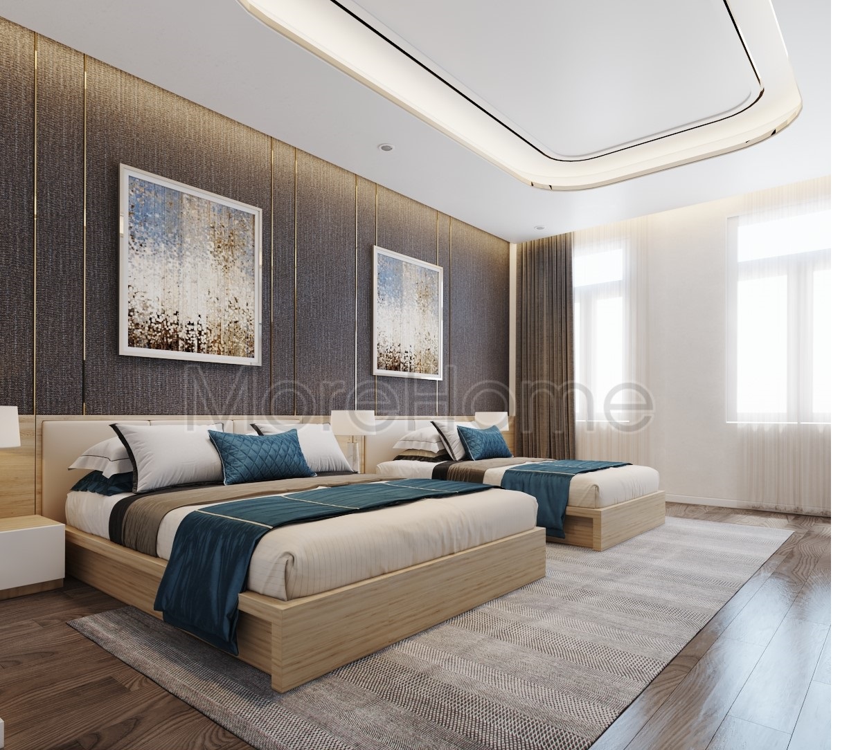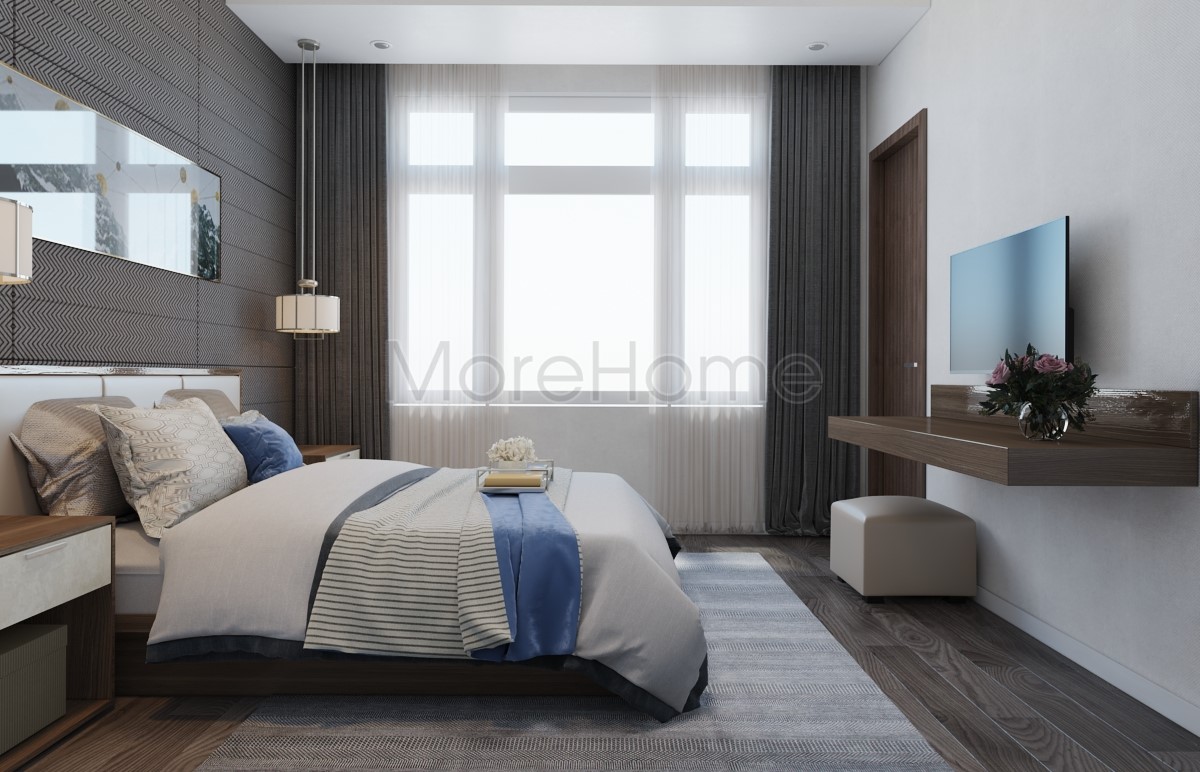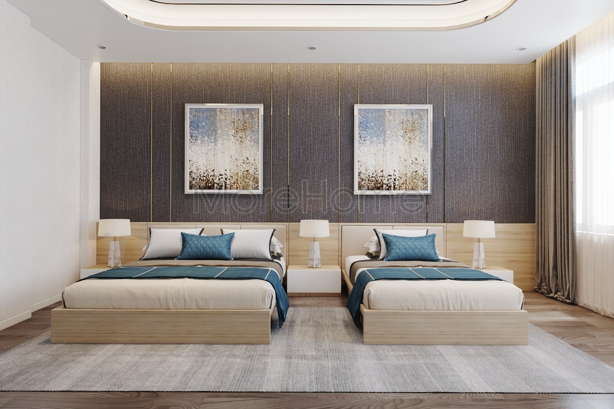 Mẫu thiết kế phòng ngủ Superior có diện tích lớn hơn, được trang bị nhiều trang thiết bị tiện nghi, có view đẹp. Sử dụng giường đôi cho khách sạn với đầy đủ tiêu chuẩn đồ dùng cho khách sạn 5 sao như ghế đơn, bàn trang điểm, đèn, thiết bị giải trí, tủ đựng đồ đầu giường, tủ quần áo, tranh tường,… Morehome lựa chọn màu sắc trung tính làm chủ đạo kết hợp với một số đường nét sắc lạnh cho không gian ấn tượng, chuyên nghiệp.